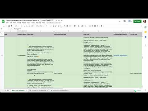 This video shows the spreadsheet that I created to serve as the source of truth for the automated customer communications. After I drafted all comms, reviewed them with stakeholders, incorporated feedback, loaded them into our CMS, and gave them to engineering, I added them to this spreadsheet as documentation. The different pages in the sheet correspond to the different backend services that house the logic that sends the comms. For crypto recurring investments, our team spun up a new service (Bamboo), which meant that I had to work closely with backend engineering to understand how the customer comms would be affected and make the necessary changes.