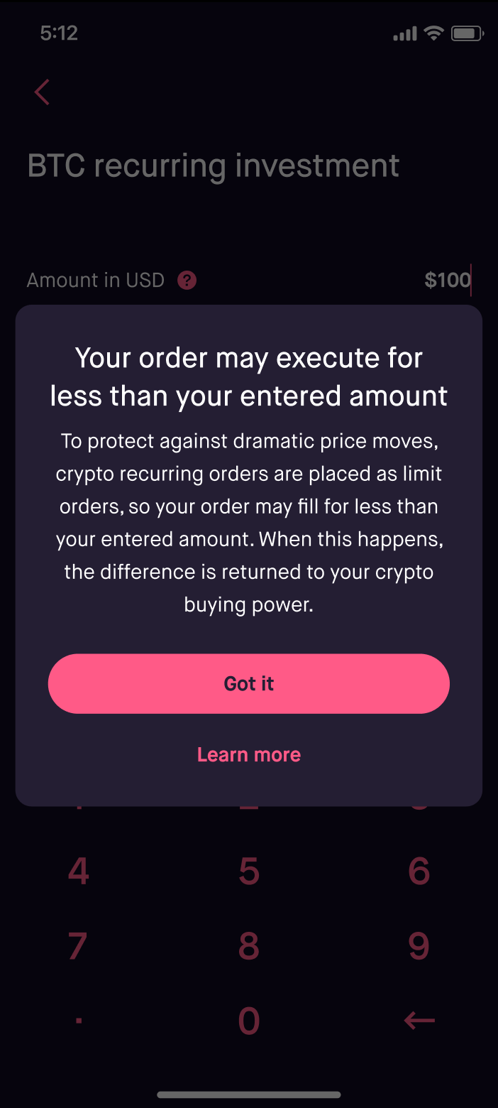 Content goal: Inform customers that they have access to crypto recurring investments, a new feature.
