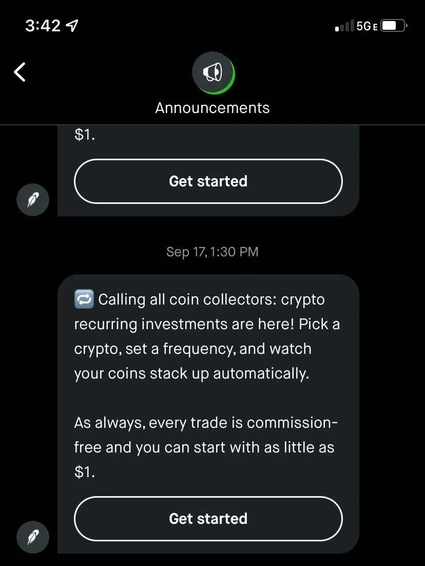 Implementation: Robinhood was the first to launch a free dollar-cost averaging tool for crypto, so we emphasized the free value prop in the header. In the first paragraph of the body, we hinted that the customer could use this to dollar-cost average over time.