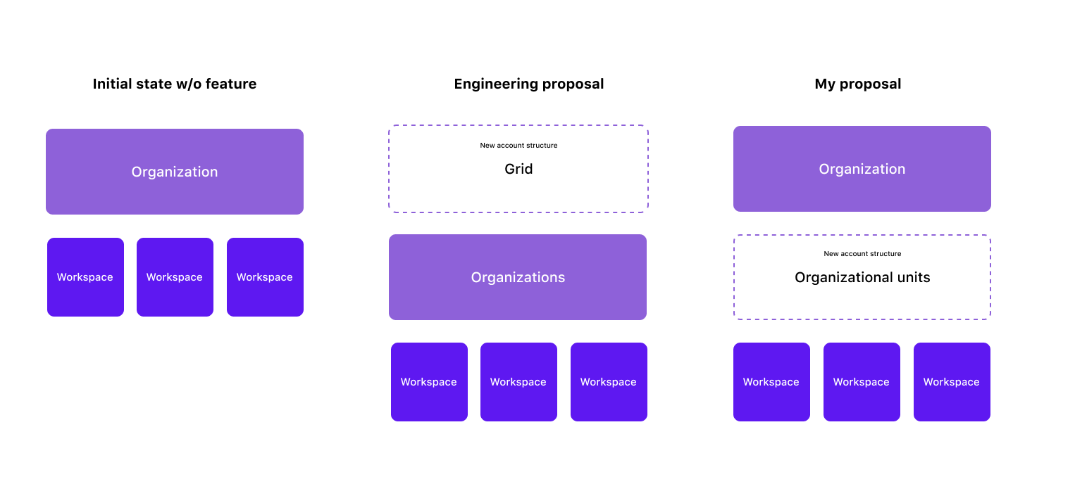 Most competitors used the term “workspace” as the second layer of the account structure, but it would’ve been too much change management for us to mirror that because of the existing meaning that “workspace” had in Airtable (it’s the primary billing unit for self-serve paid plans). I also pushed to keep “organization” as the top layer account structure so it wouldn't have a plan-dependent definition—customers would “unlock” an additional account structure that sat below an “organization” instead of having the definition of “organization” change.