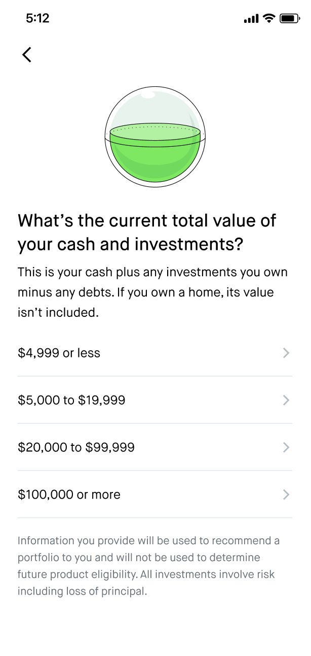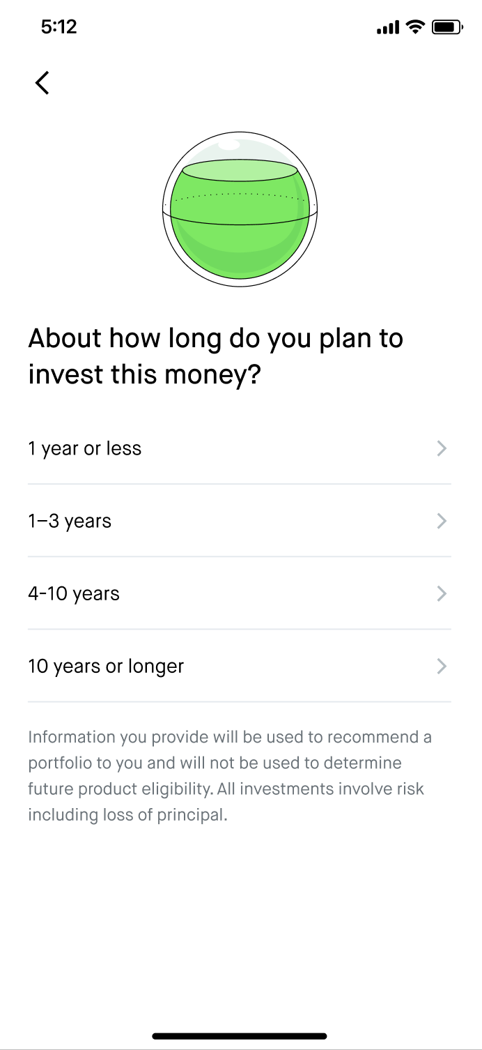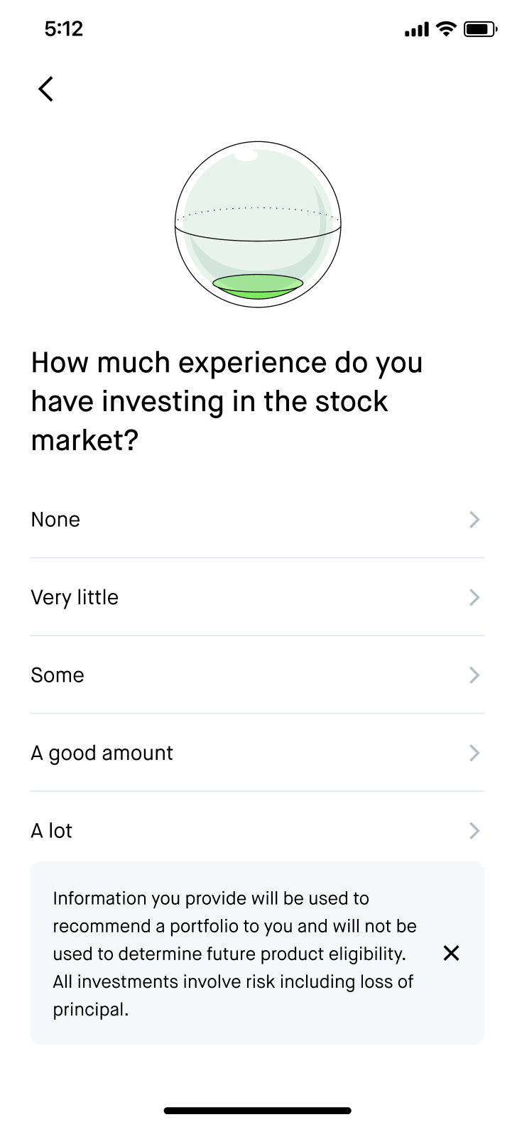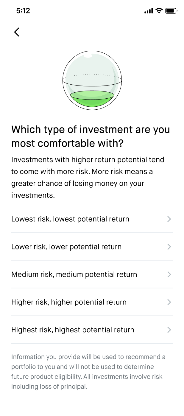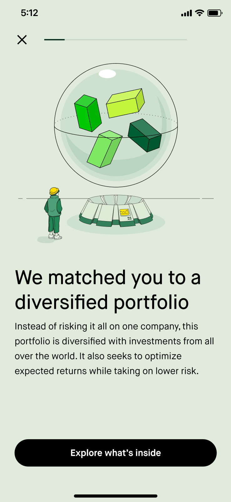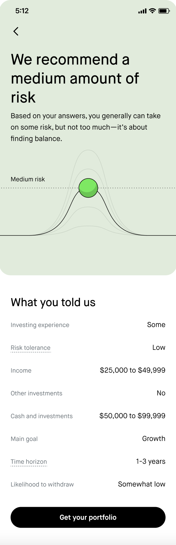 Solution: We designed an immersive experience where the customer answers a set of questions, learns which level of investing risk is right for them based on their answers, and then is recommended a small, diversified portfolio of four exchange-traded funds (ETFs) that matches their risk level. They can then invest in that portfolio in a bulk checkout flow. To make investment recommendations as a self-directed broker-dealer, we have to comply with the SEC’s Regulation Best Interest.