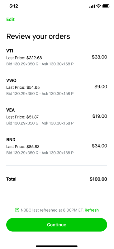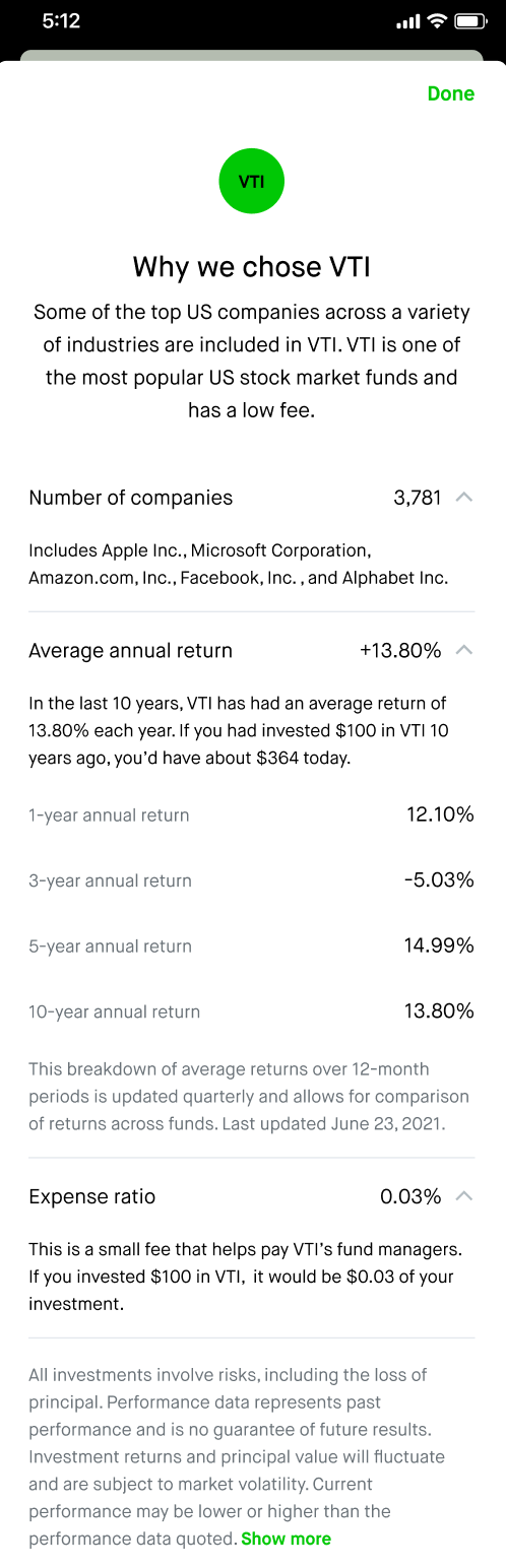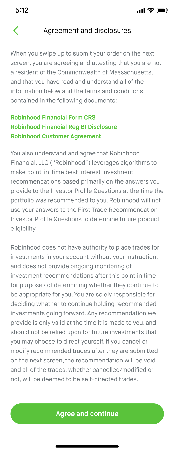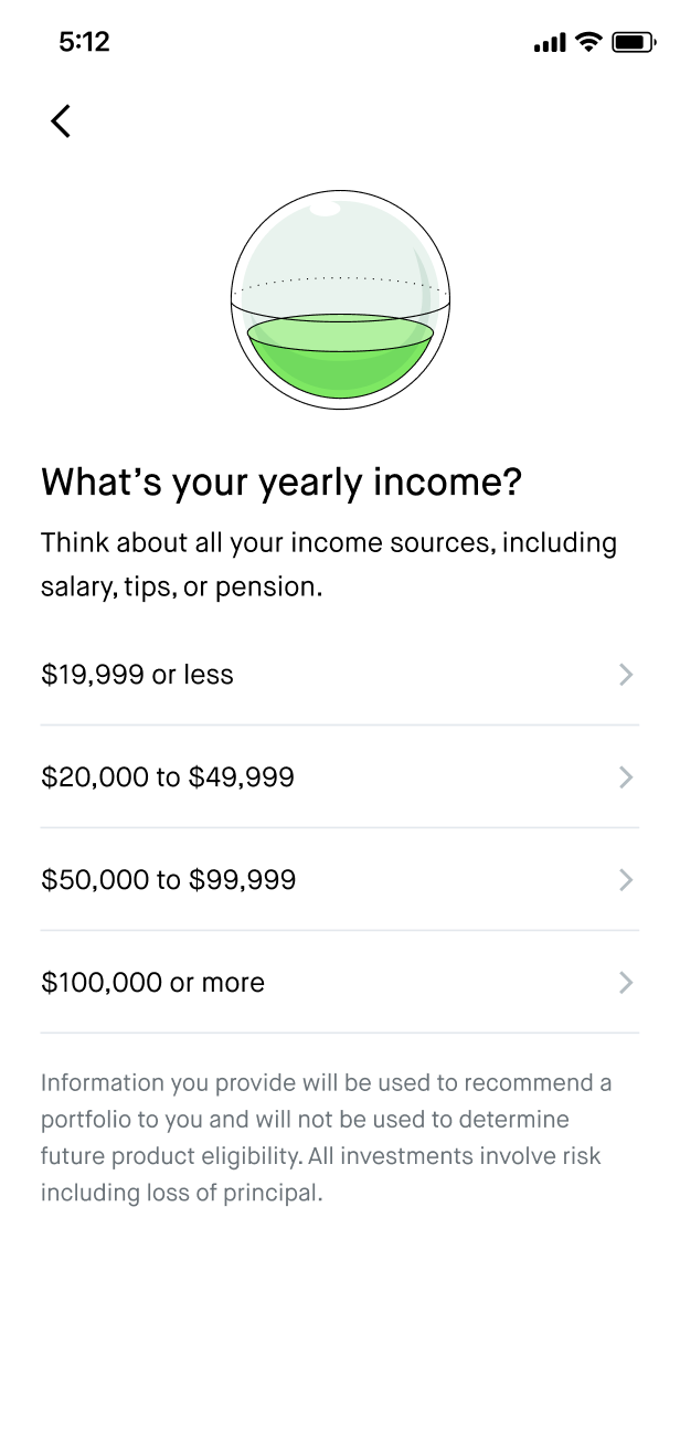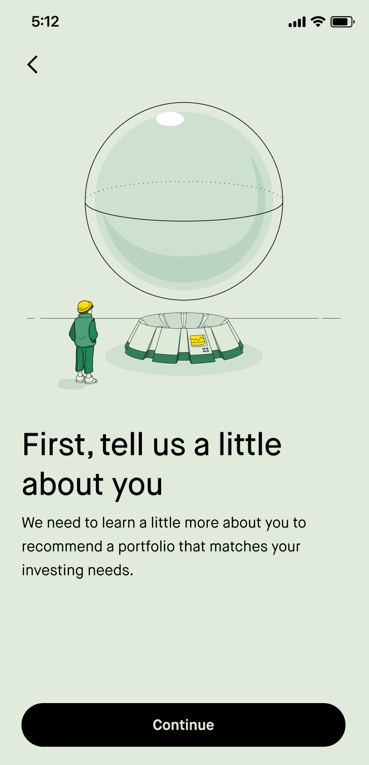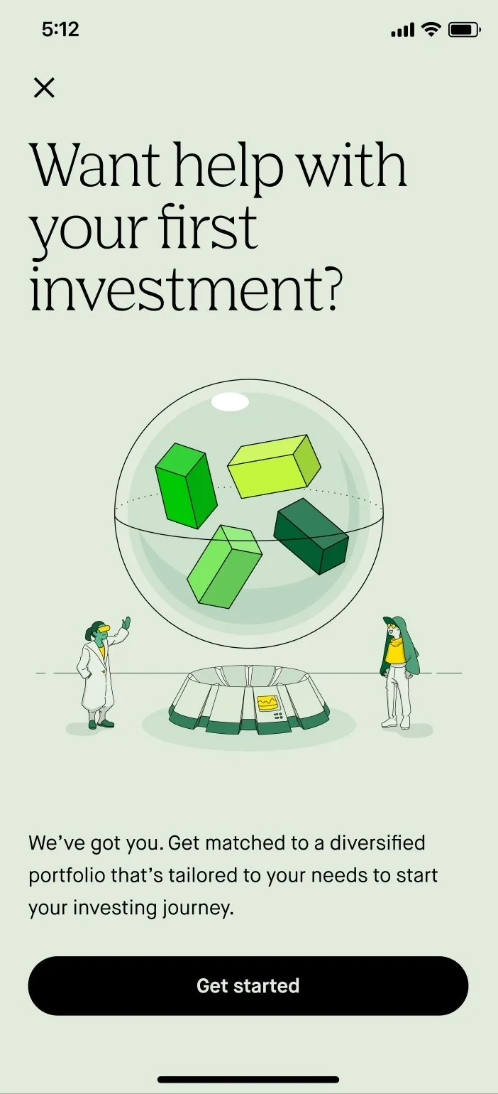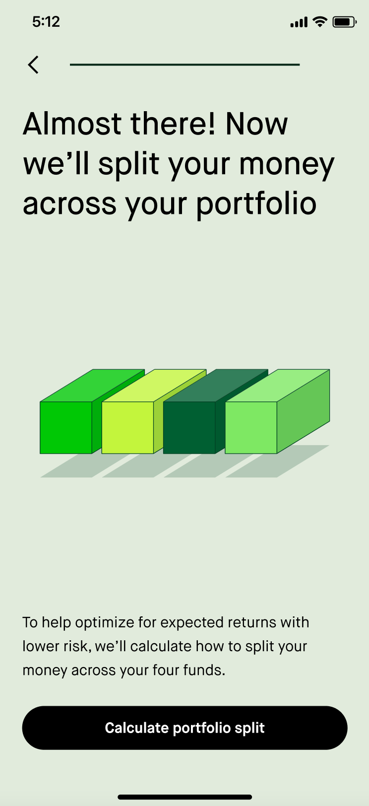 Solution: We designed an immersive experience where the customer answers a set of questions, learns which level of investing risk is right for them based on their answers, and then is recommended a small, diversified portfolio of four exchange-traded funds (ETFs) that matches their risk level. They can then invest in that portfolio in a bulk checkout flow. To make investment recommendations as a self-directed broker-dealer, we have to comply with the SEC’s Regulation Best Interest.