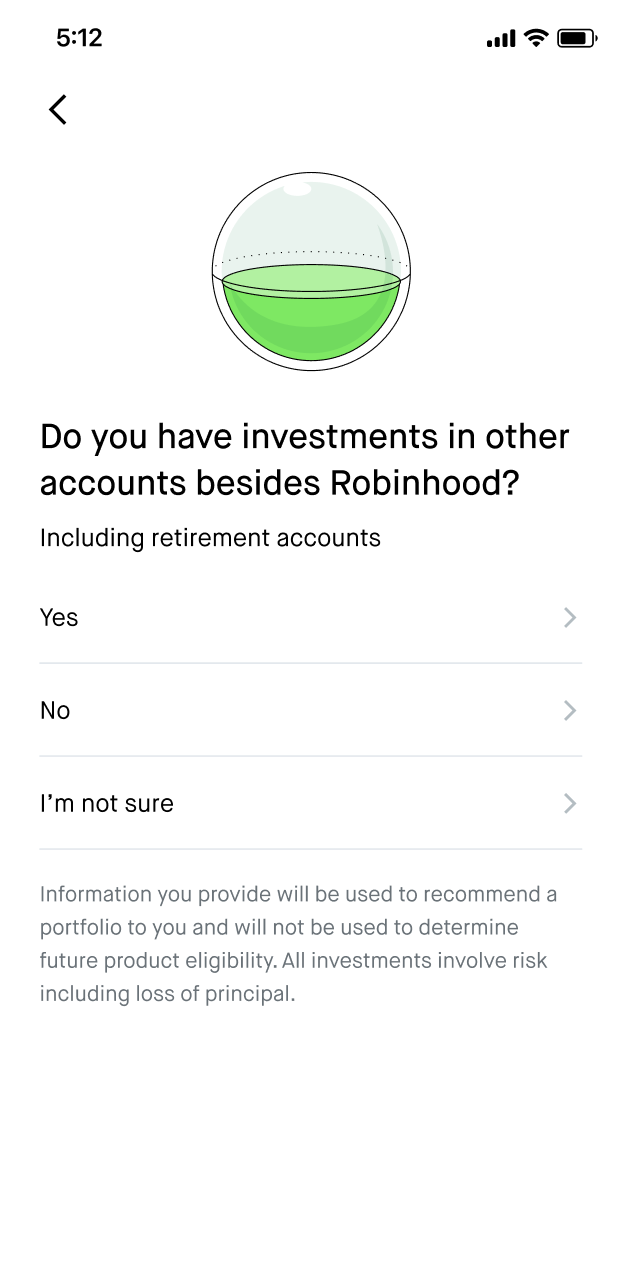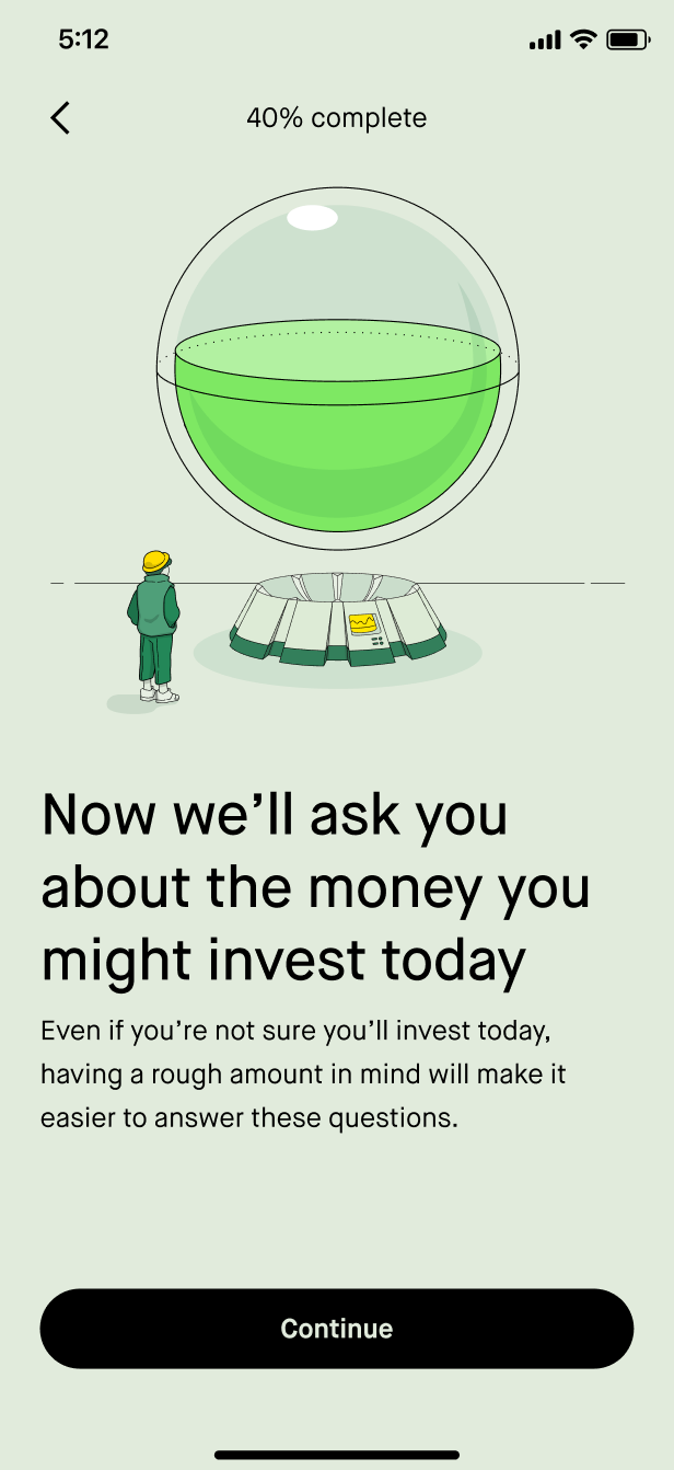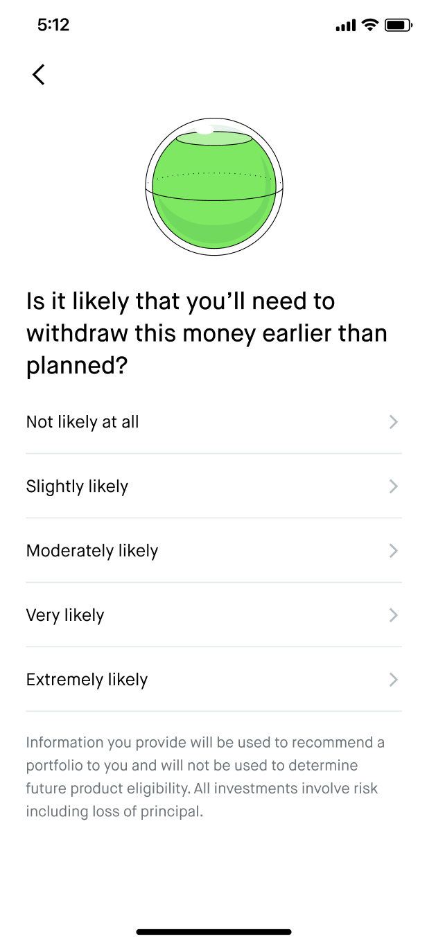 The experience begins with a few introductory screens that lead into the questionnaire, which assesses the customer’s investing needs to match them with a risk level for their portfolio. To comply with Regulation Best Interest, we had to be aware of many legal guardrails. The questionnaire itself went through at least 6 rounds of revision and review from a large group of stakeholders across product, legal, and compliance.