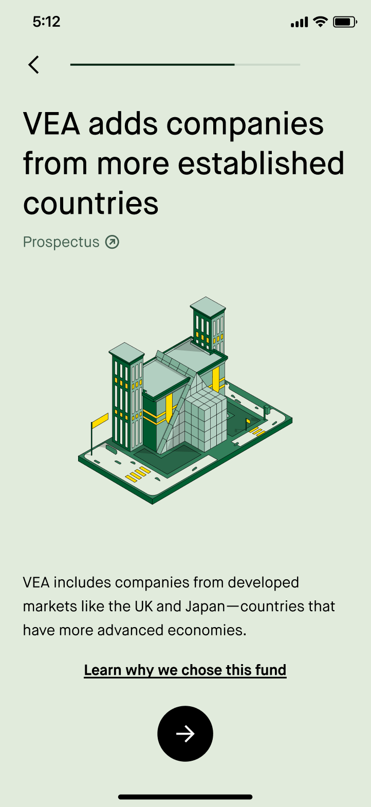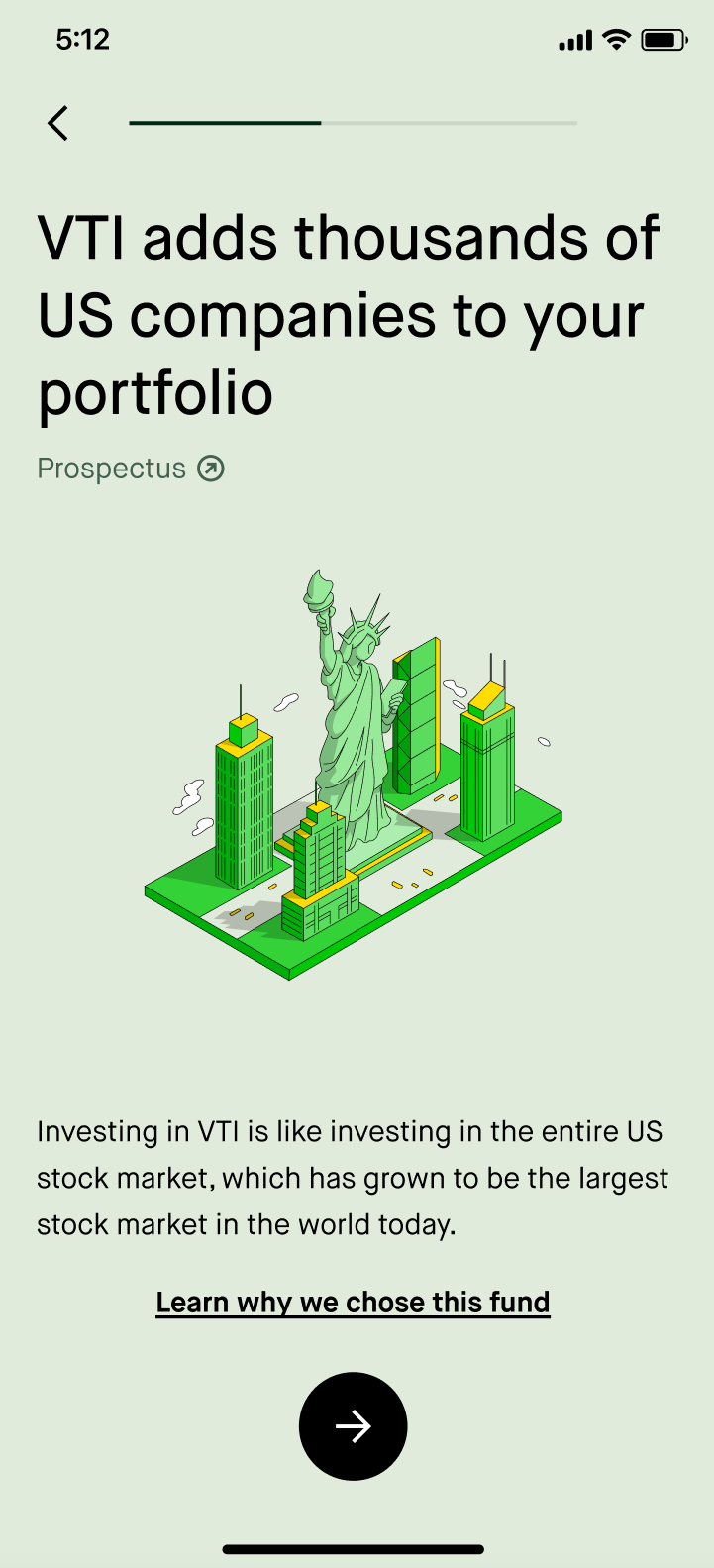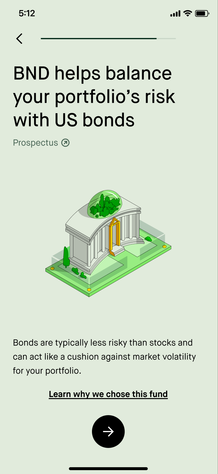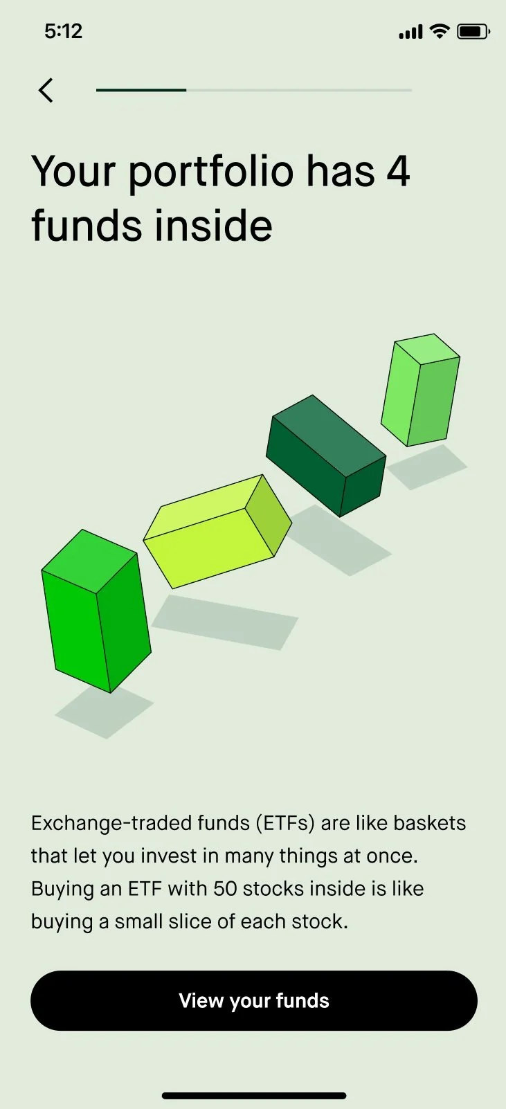 We called this section of the flow the “walkthrough” because we structured it to present new information one-by-one in an immersive, narrative experience. Customers are introduced to ETFs, diversification, and the specific ETFs in their portfolio.