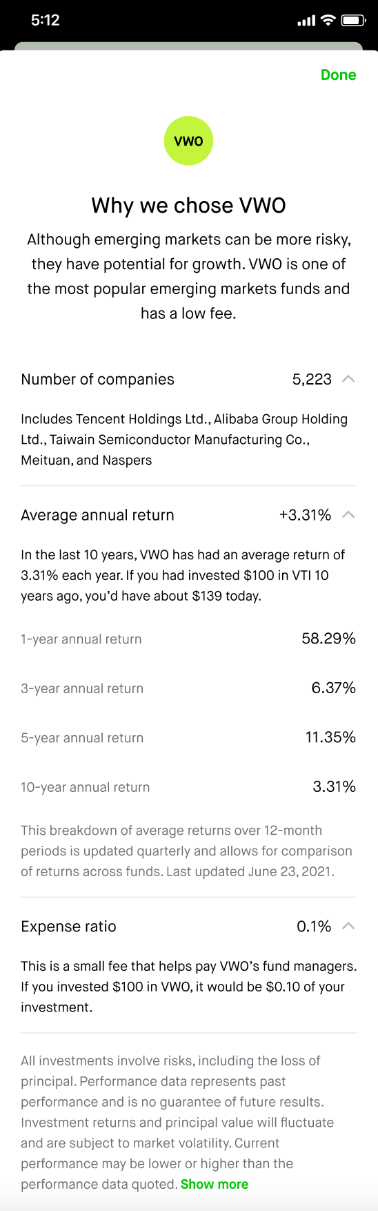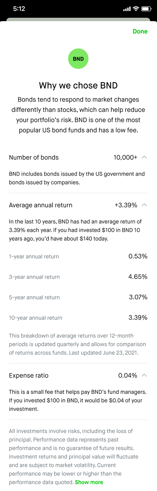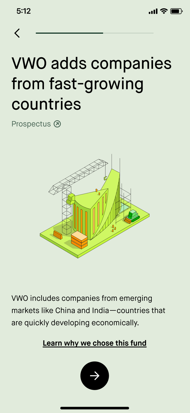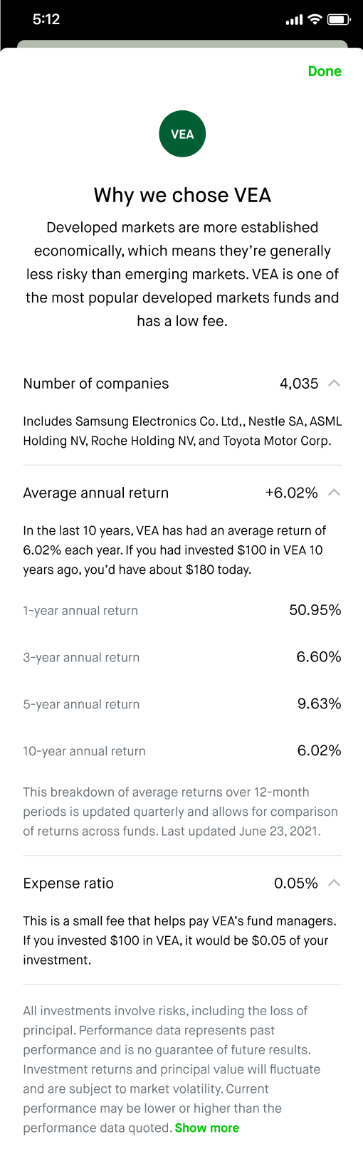 We called this section of the flow the “walkthrough” because we structured it to present new information one-by-one in an immersive, narrative experience. Customers are introduced to ETFs, diversification, and the specific ETFs in their portfolio.