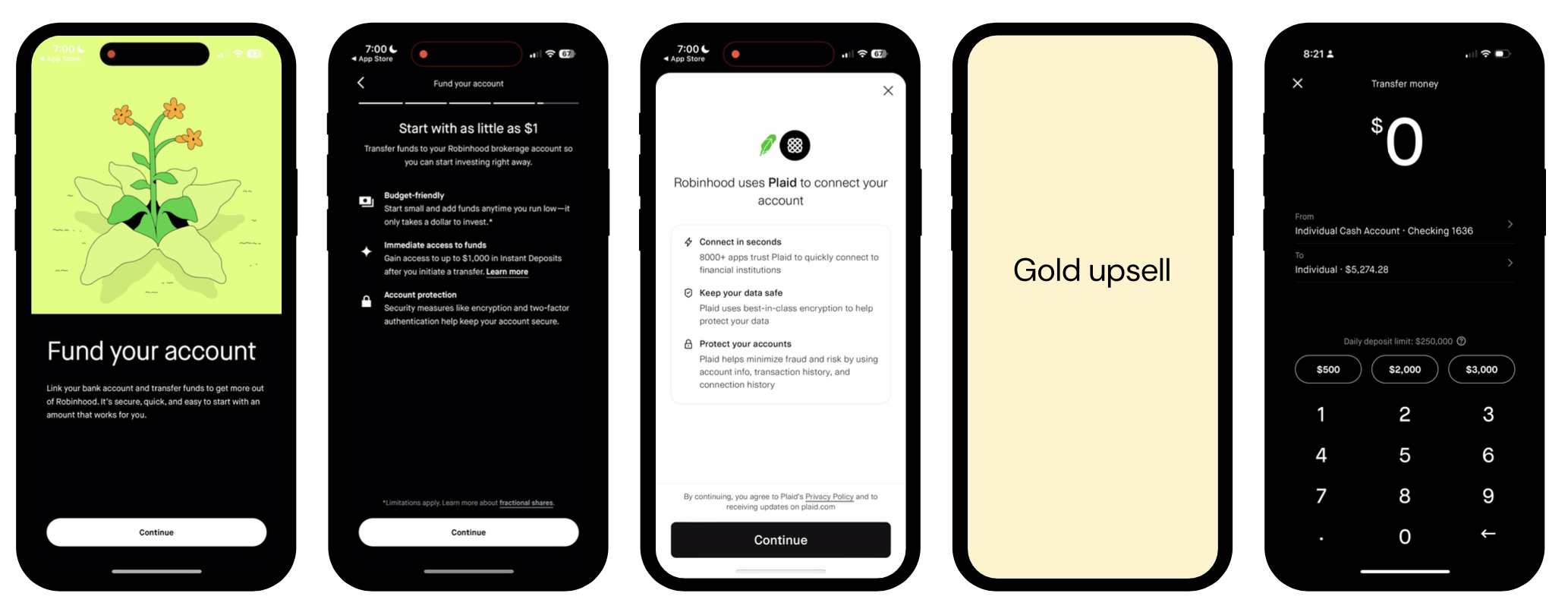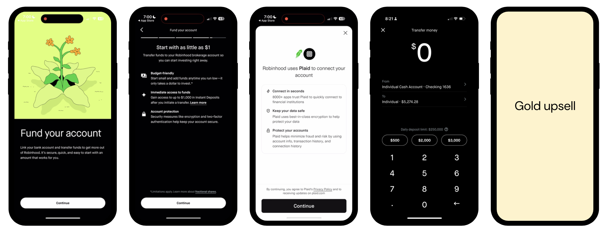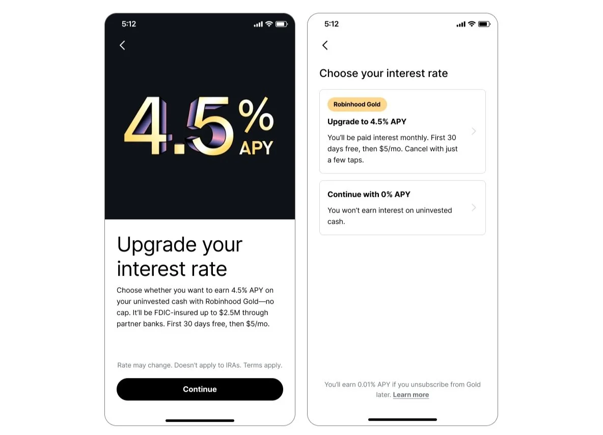 However, I had been trying to think about the funding flow and Gold upsell holistically as an information experience, and I suspected that post-deposit still wasn't the right moment, even if the design felt more native. We were asking users to opt in to a membership that offered significant deposit-related benefits, like APY and FDIC insurance, but we were doing it after they had already put money into Robinhood.