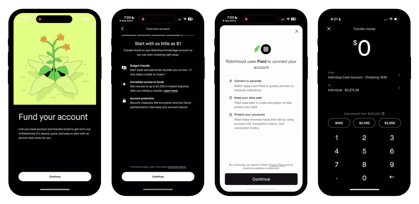 Our funding flow within onboarding. Chapter header ➡️ Expectation-setting screen ➡️ Bank linking ➡️ Deposit step