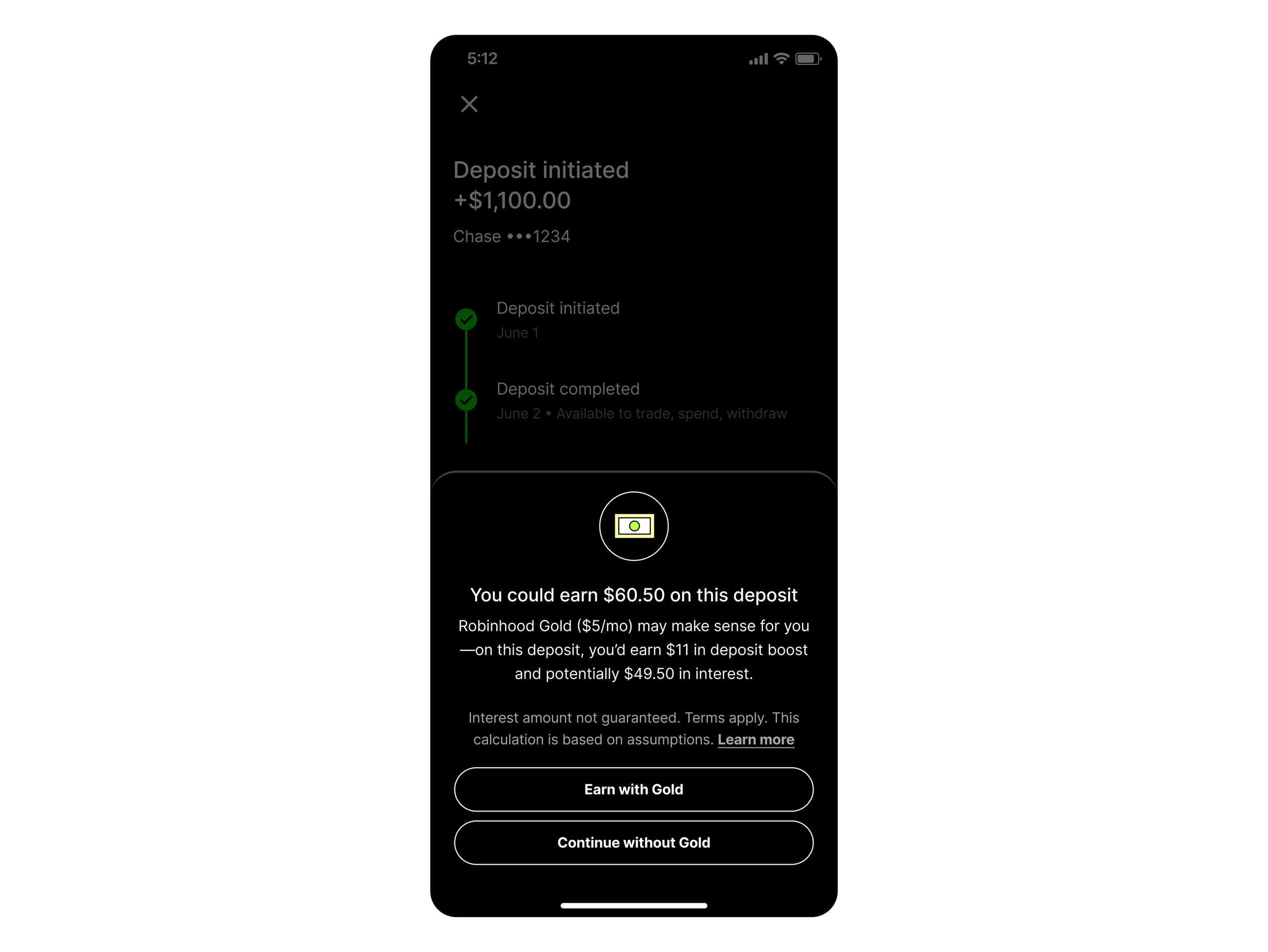 Ultimately, my product designer and I decided to use a contextual bottom sheet that would appear after the user had completed their transfer. We also wanted to make sure we were showing this message only when it would be relevant to users, so we segmented the audience based on a user’s deposit amount. We decided to only show the bottom sheet if a user deposited an amount that hit the “Gold breakeven point”—the amount at which the user would “break even” with interest income on the $5 monthly fee (around $1,100 at the time). This ensured that we were showing the Gold upsell to the users it was most relevant to, and not spamming users who wouldn’t get value out of Gold.