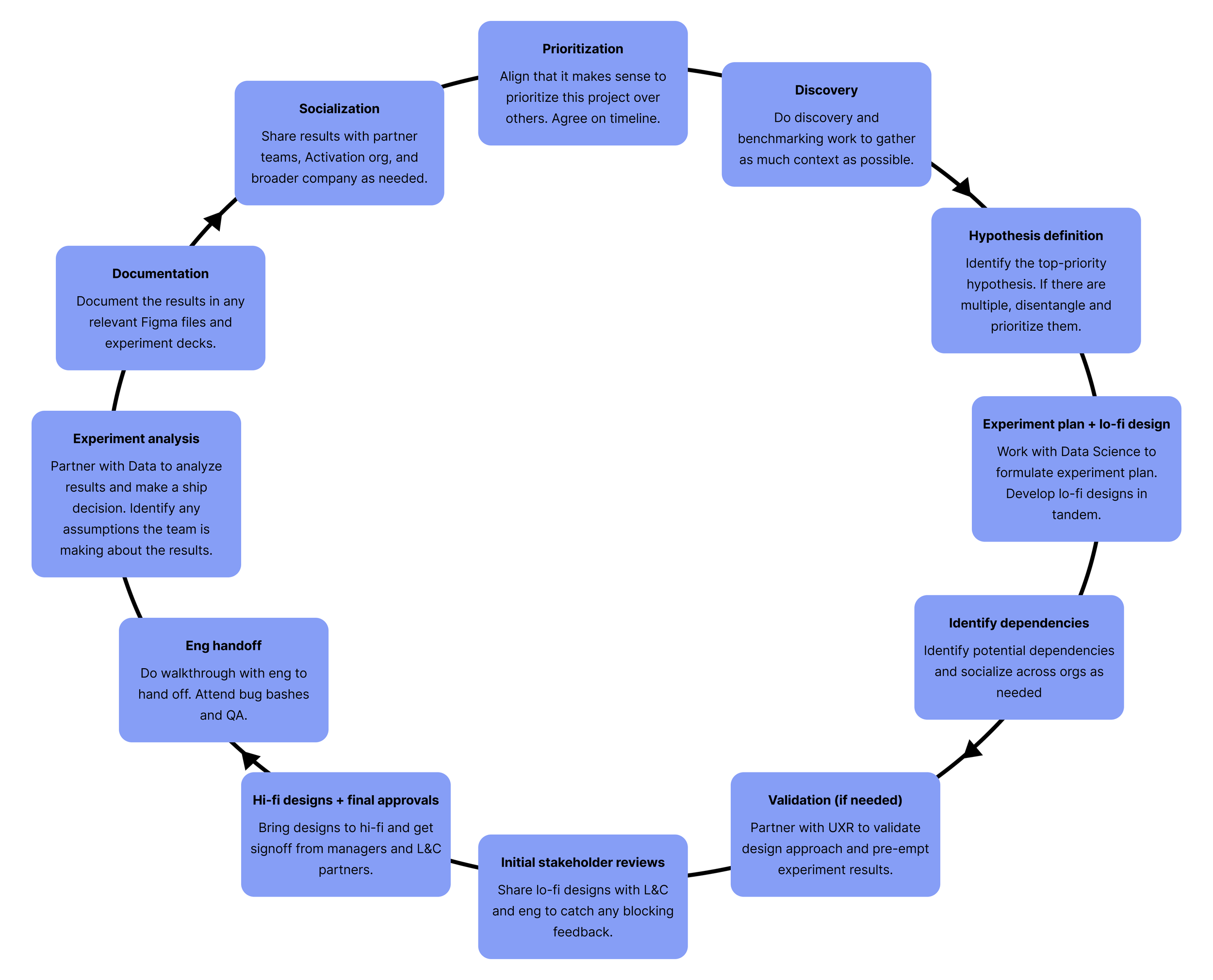 I visualized this process as a circle because the latter steps of experiment analysis, documentation, and socialization typically directly influence the team’s subsequent prioritization decision for the next experiment. In the playbook, I wrote up detailed guidance for each step of the process using my experience from being on the team and learnings from the Growth Design course I took in spring 2024.