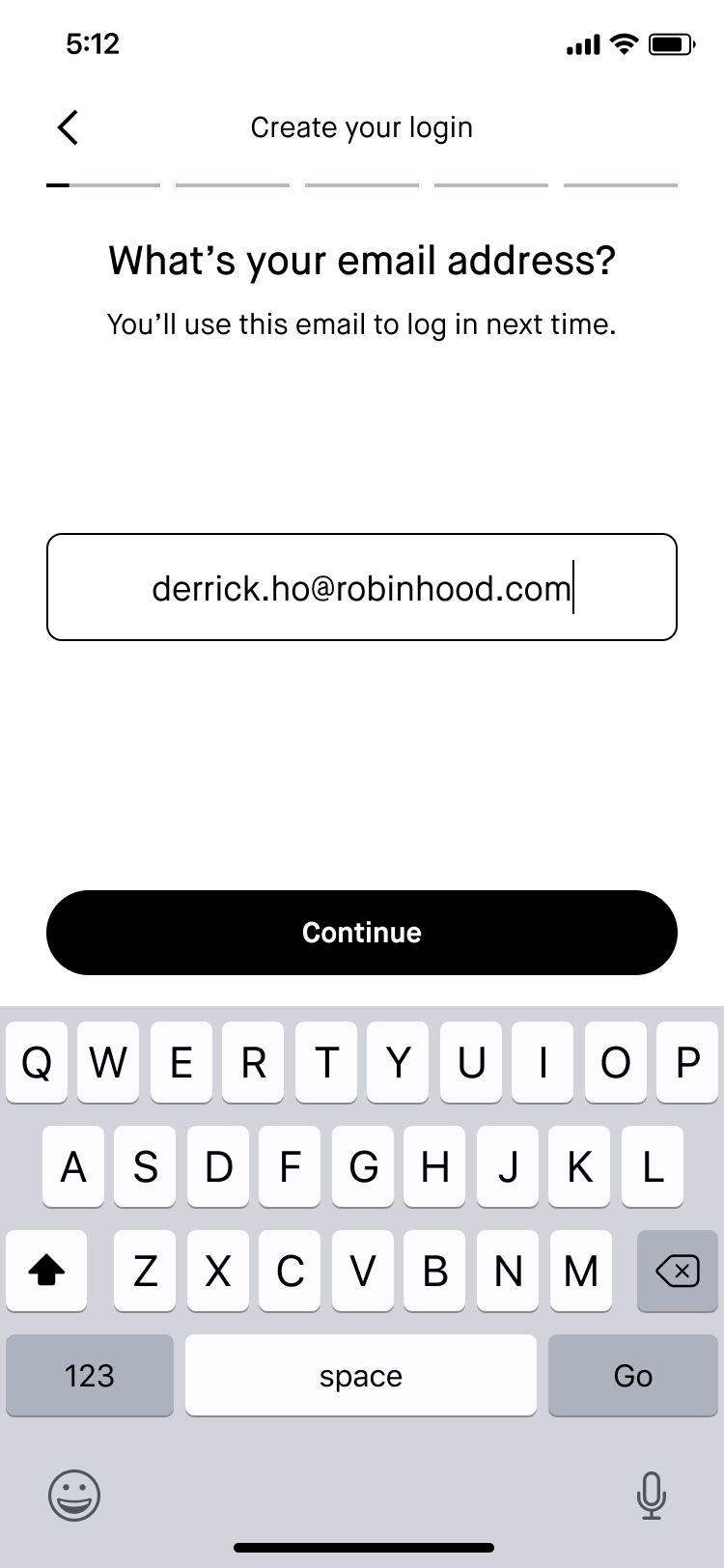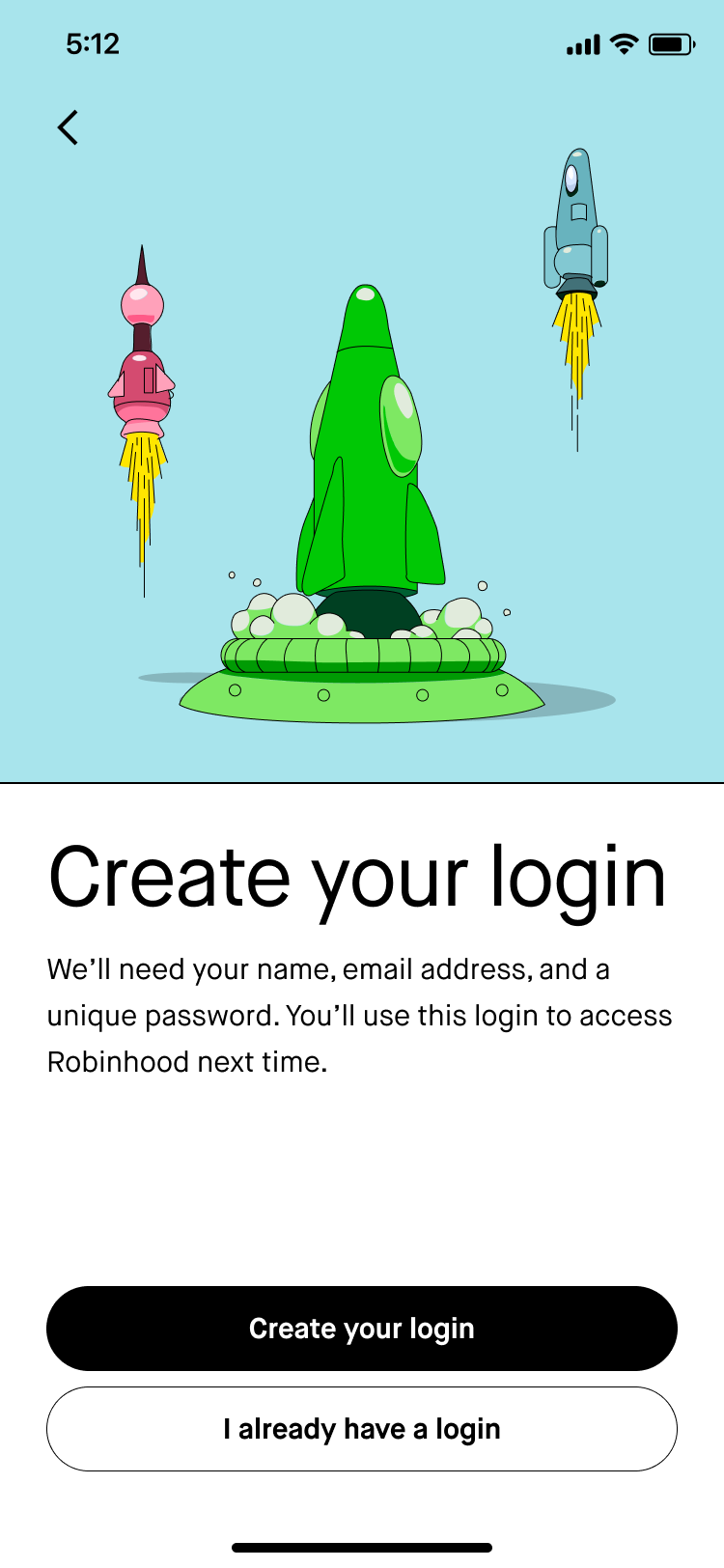 Implementation: “Create login” encapsulates the first 2 steps of this section of the flow. I couldn’t say “Create account” because I wanted to future-proof for when Robinhood will offer multiple accounts that the customer will be able to access with one login. “You’ll use this login to access Robinhood next time” signals to the customer that they should keep this information handy for the next time they log in.