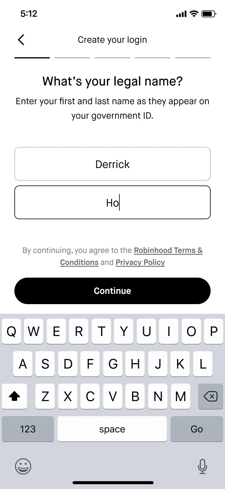 Implementation: “as they appear on your government ID” clarifies that this should be the name that the US government knows them by. I also had to work with Legal and Compliance to add button bar text with links to our T&C and privacy policy, since account creation technically happens after the customer proceeds past this screen.