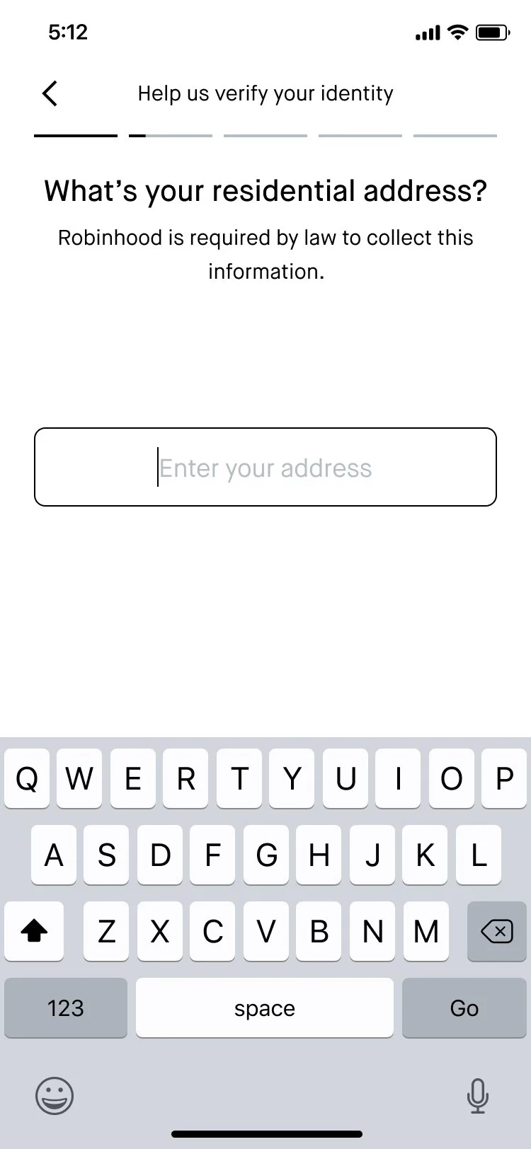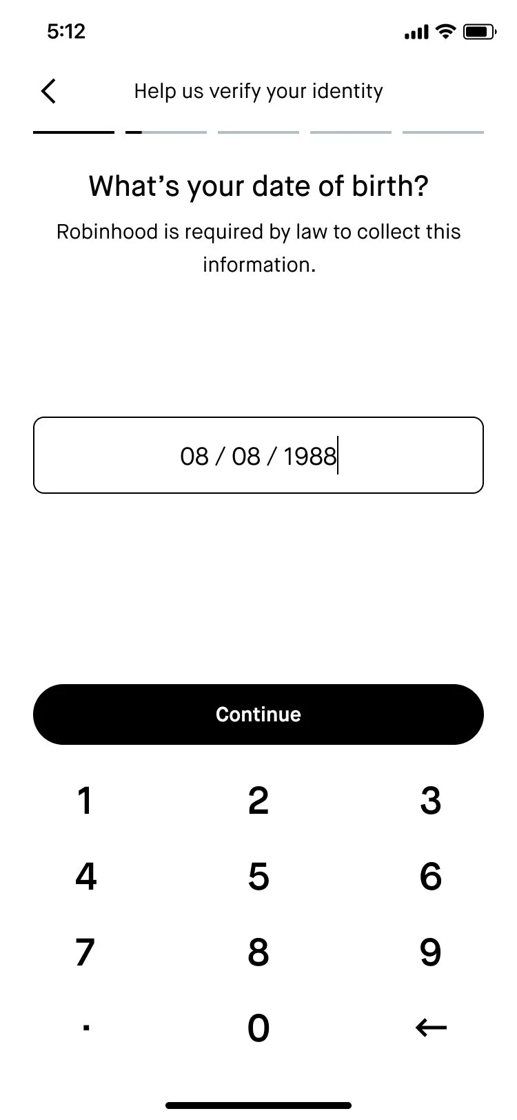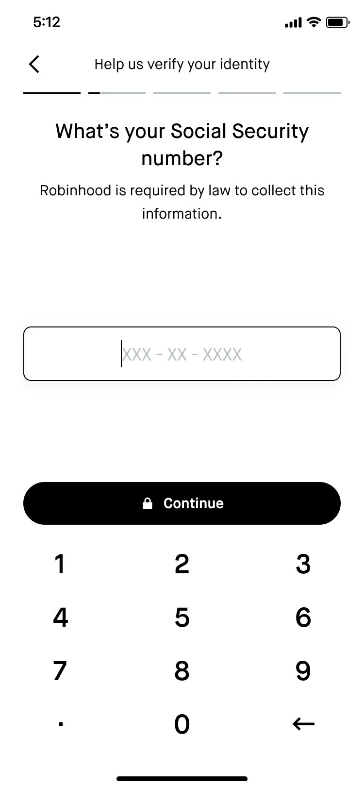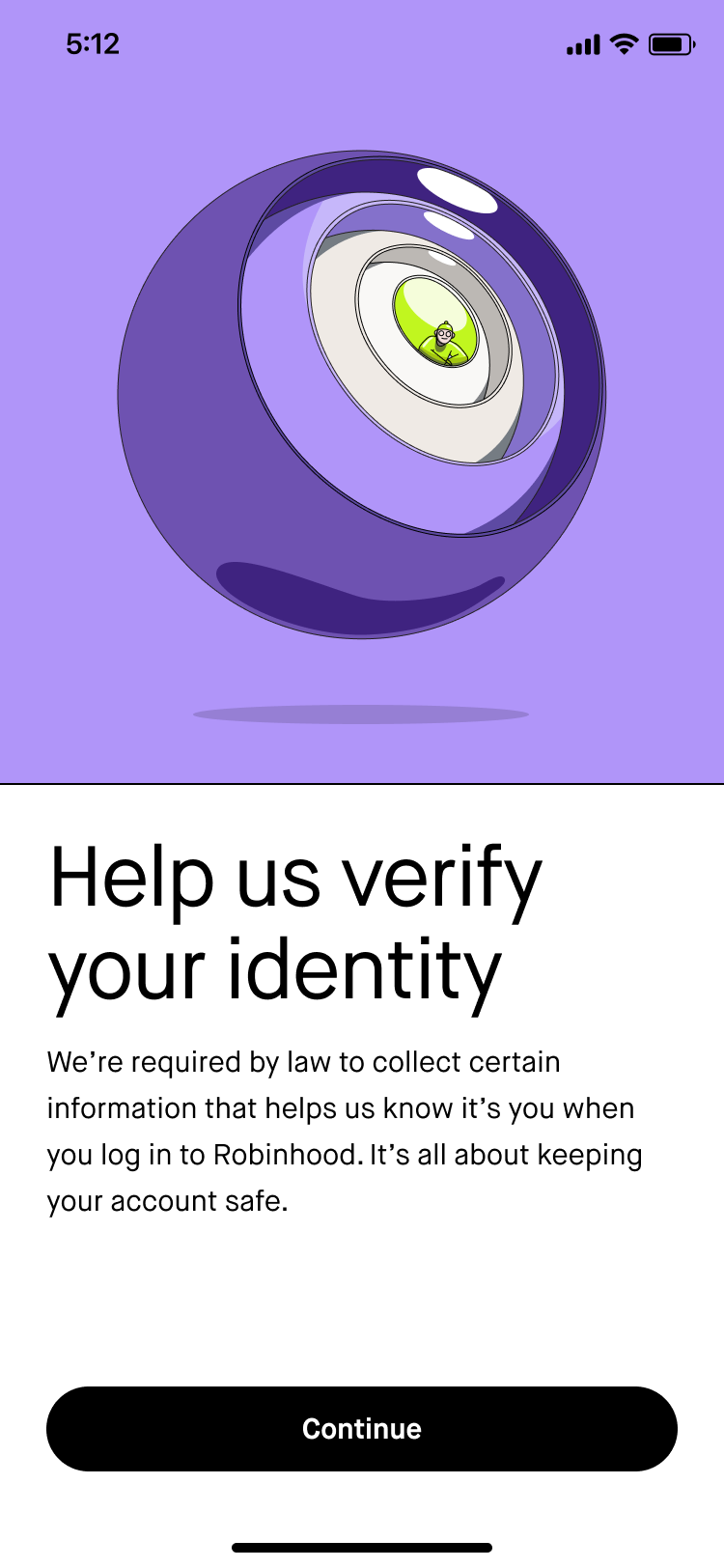 Implementation: “Help us” makes the header an imperative, which is consistent across all of these chapter header screens. In past UX research, we’ve observed that customers are generally understanding when we mention that we’re collecting information for legal reasons, so I figured it would be good to lead with that in the subheader. I also tried to give them some insight into the “why” here—it “helps us know it’s you when you log in to Robinhood” and “It’s all about keeping your account safe.”