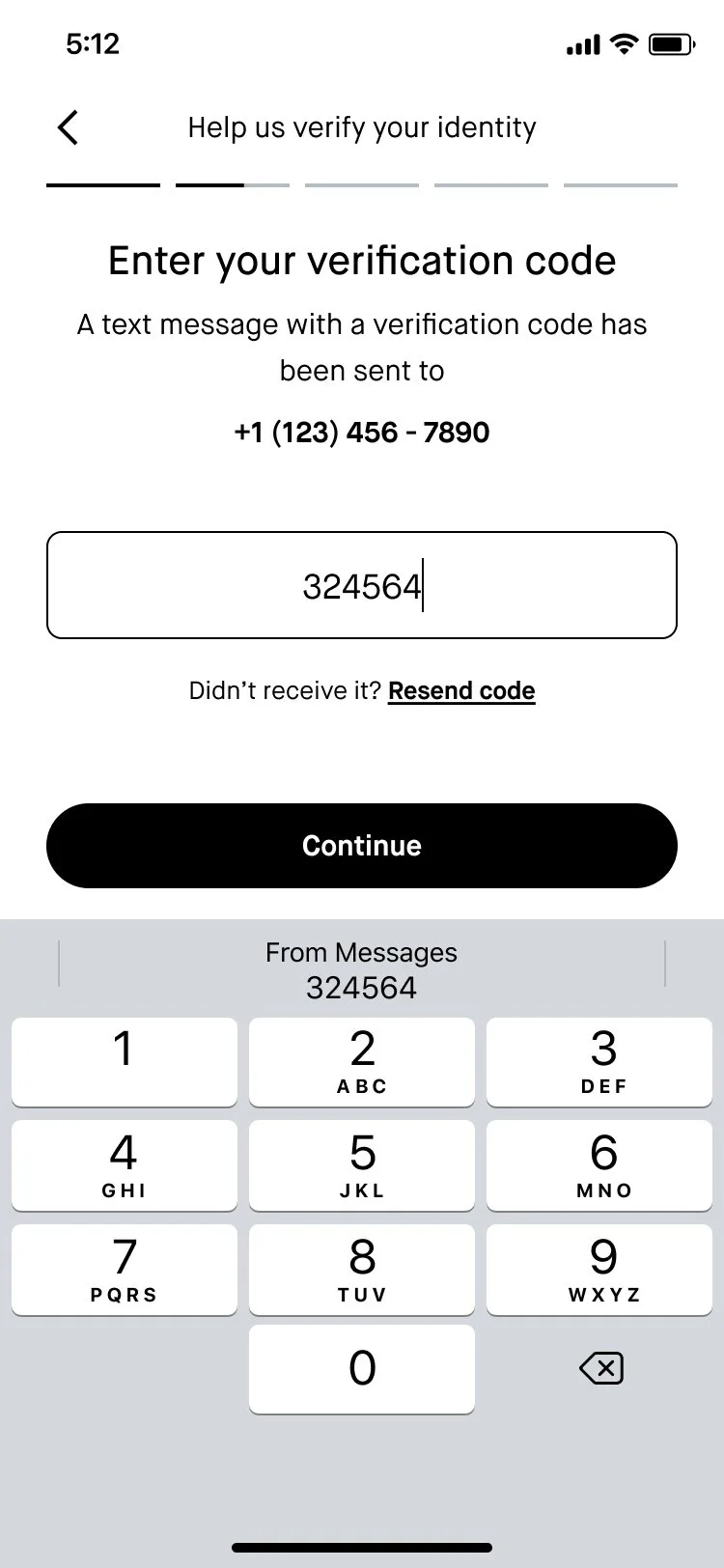 Implementation: Used “Enter” imperative for header. Reiterated what just happened in the subheader. Used text below input field to help users re-send the code if they didn’t receive it.