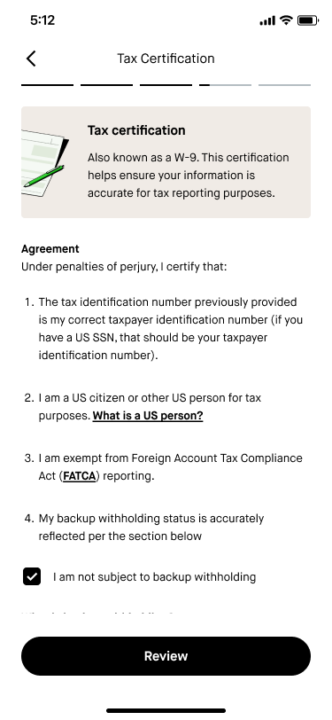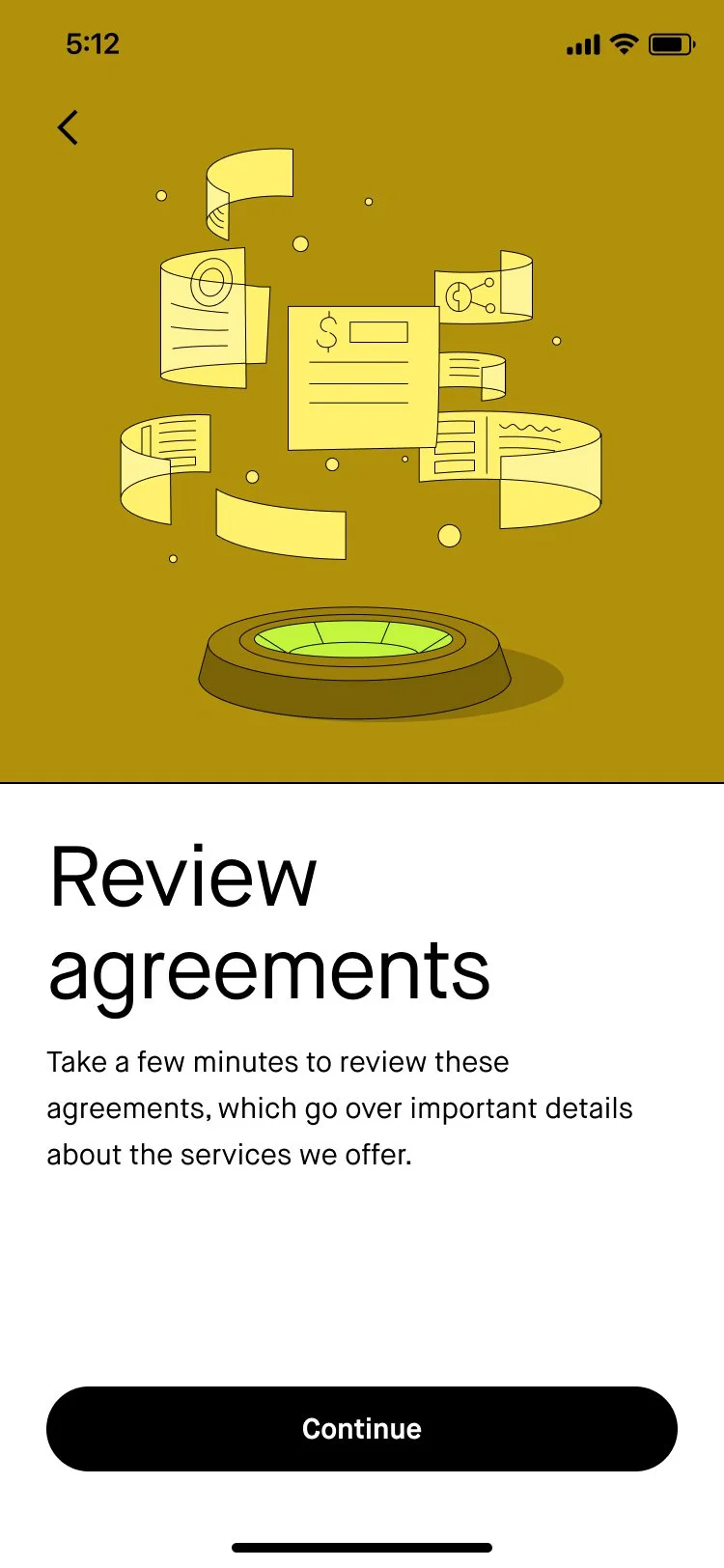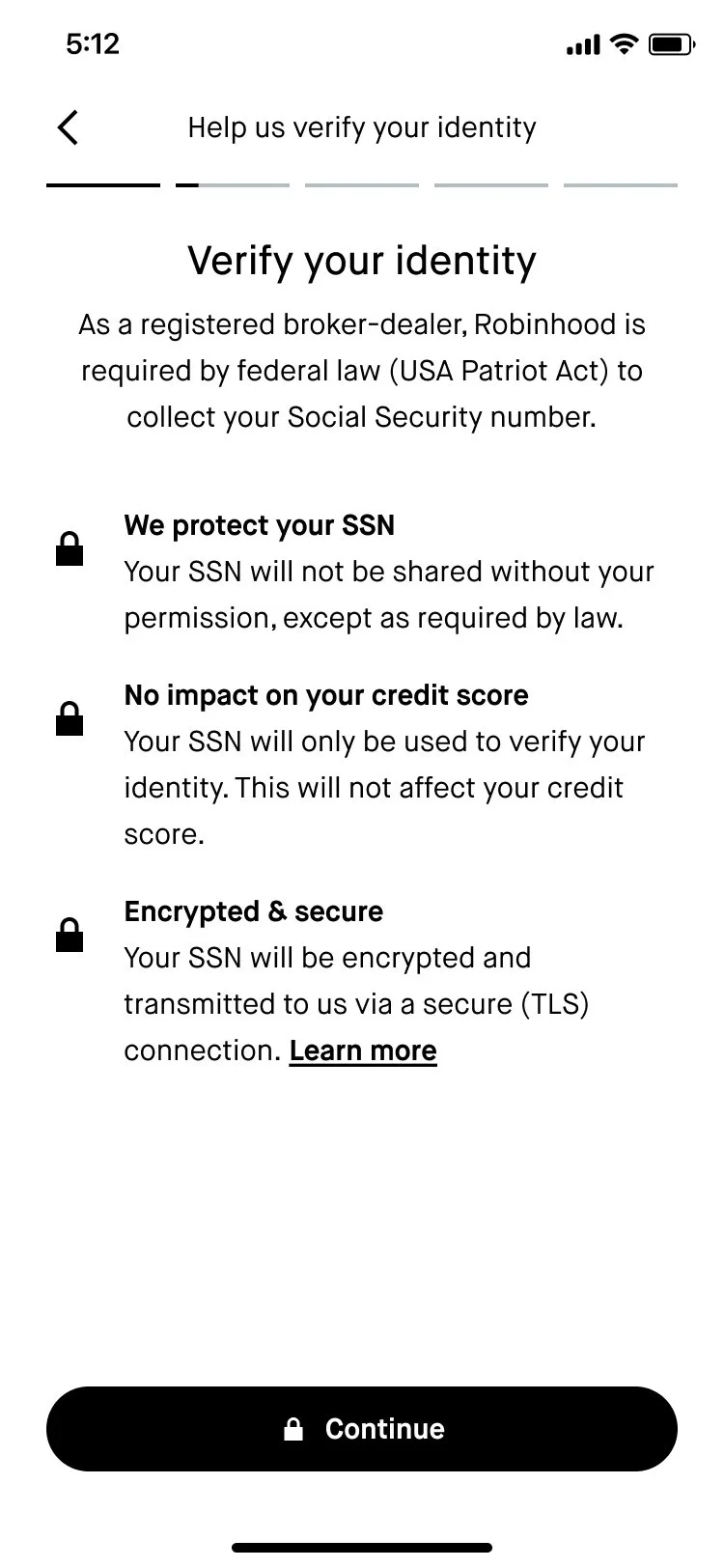 Implementation: Kept the header more generic (“Verify your identity” instead of “Provide your SSN”) to focus the screen on why we’re asking for SSN. The subheader is more specific about which federal law requires us to collect this information, so the customer can research it on their own if that helps them feel better. The three bullet points address common concerns we heard from customers around how their information would be protected and if providing it would impact their credit score. Even though providing SSN is a pretty standard part of opening a bank or brokerage account, we wanted to design for the customer who hadn’t done this before and would have questions.