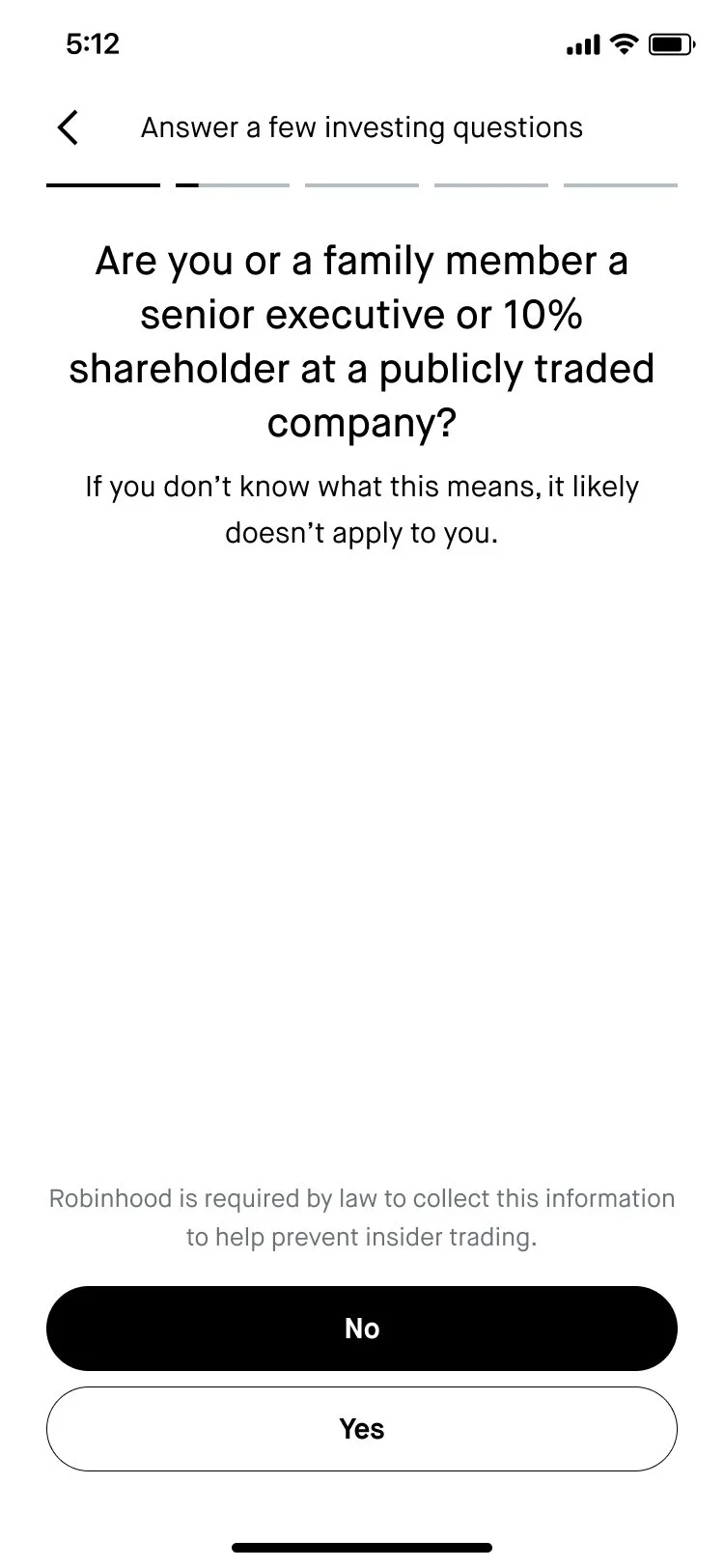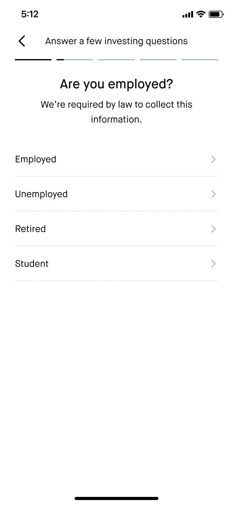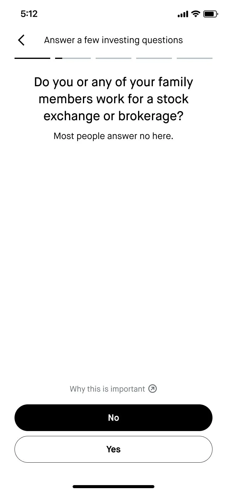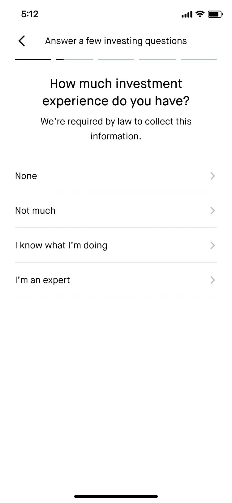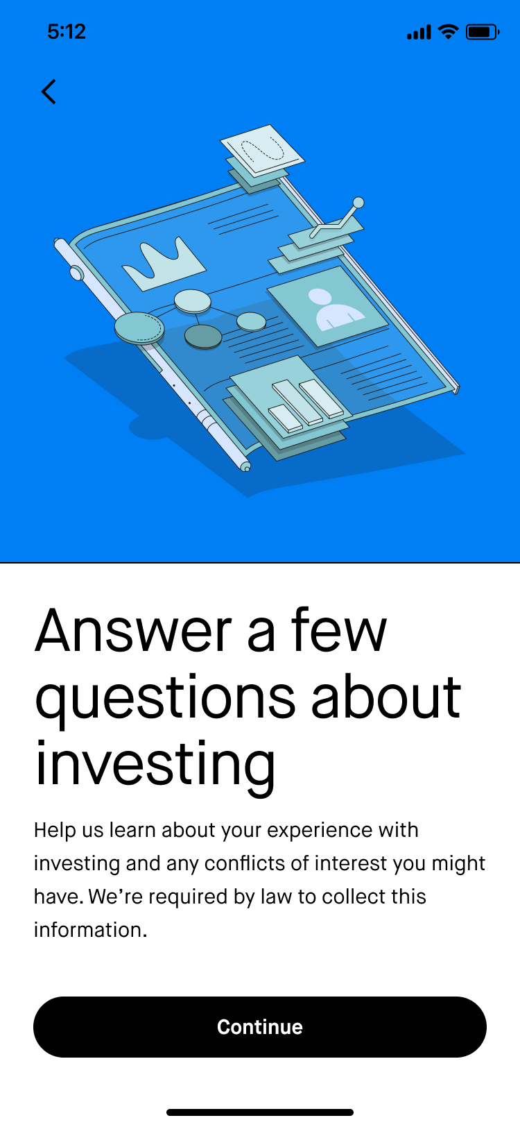 Implementation: These questions didn’t fit neatly into one category. Internally, the team called this the “investment profile” section because it includes one investment profile question (the investment profile is a specific set of investing-related questions that regulators require us to ask once the customer has an approved brokerage account), but I wanted us to be more encompassing with how we were grouping these questions so we weren’t misusing terminology. I made the header more vague (“questions about investing”) and tried to summarize themes from the 4 questions in the subheader. And once again, I reiterated that this section is also required by law.